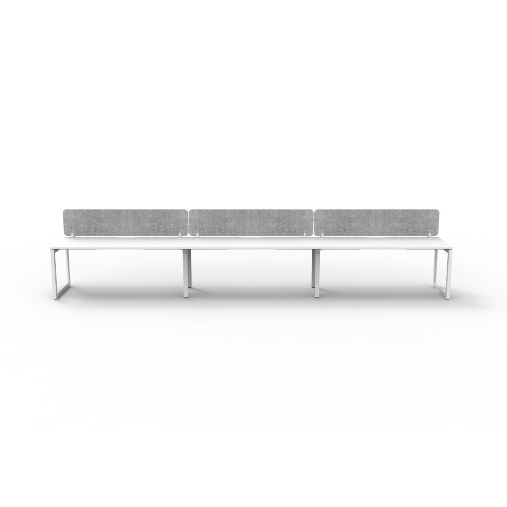 3 person single sided workstation with White top and White Satin frame, Grey Eco screen.