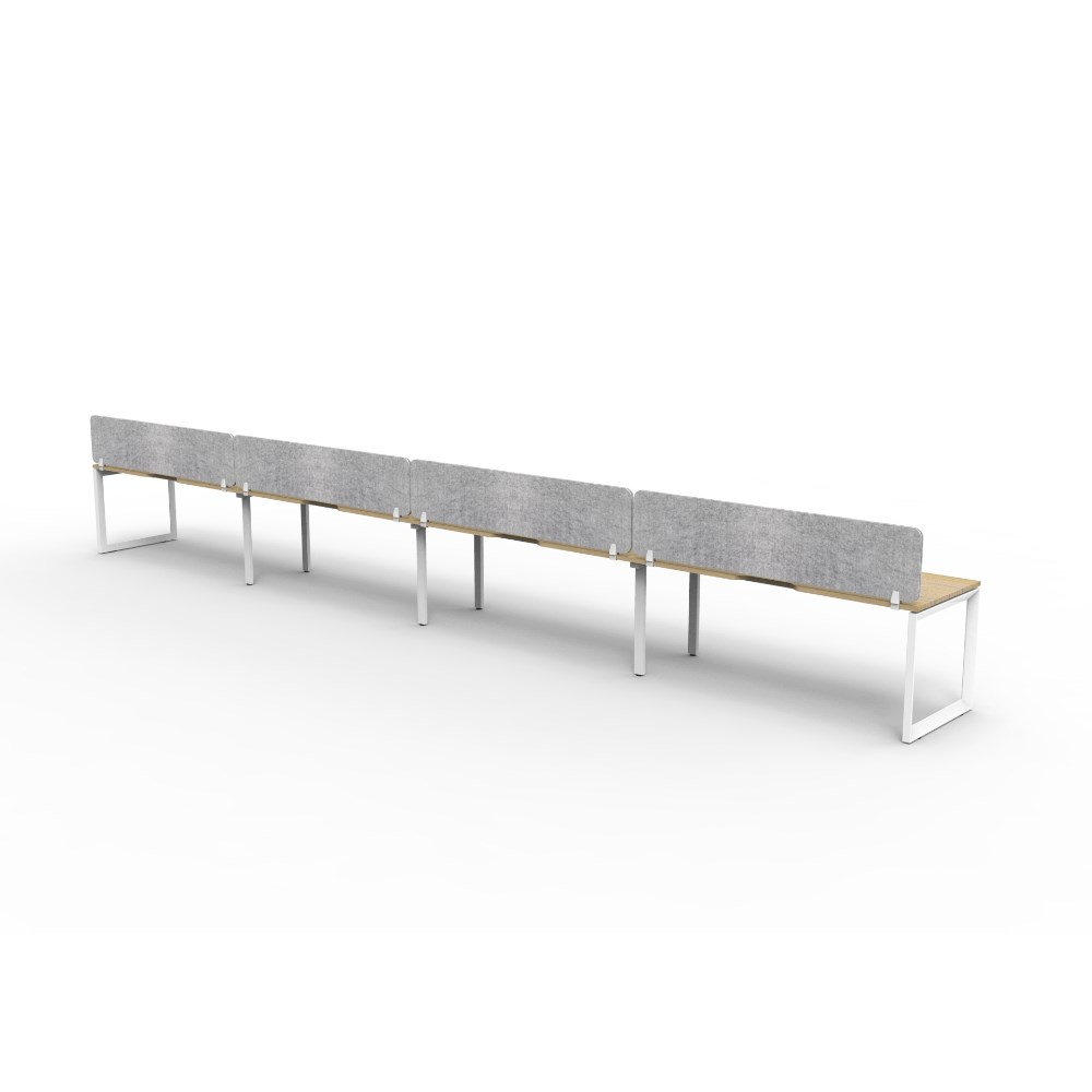 4 person single sided workstation with Natural Oak top and White Satin frame, Grey Eco screen.