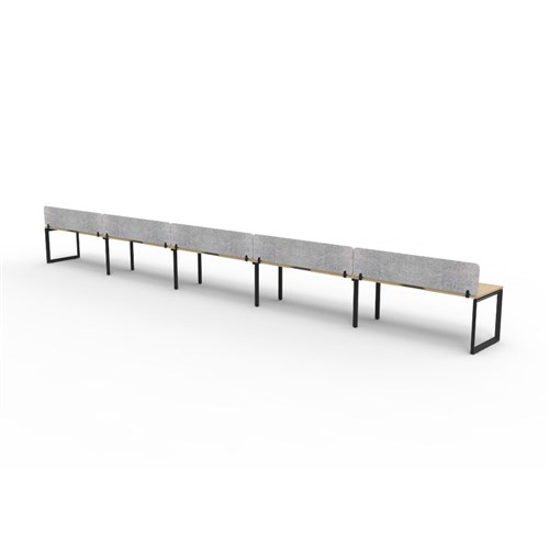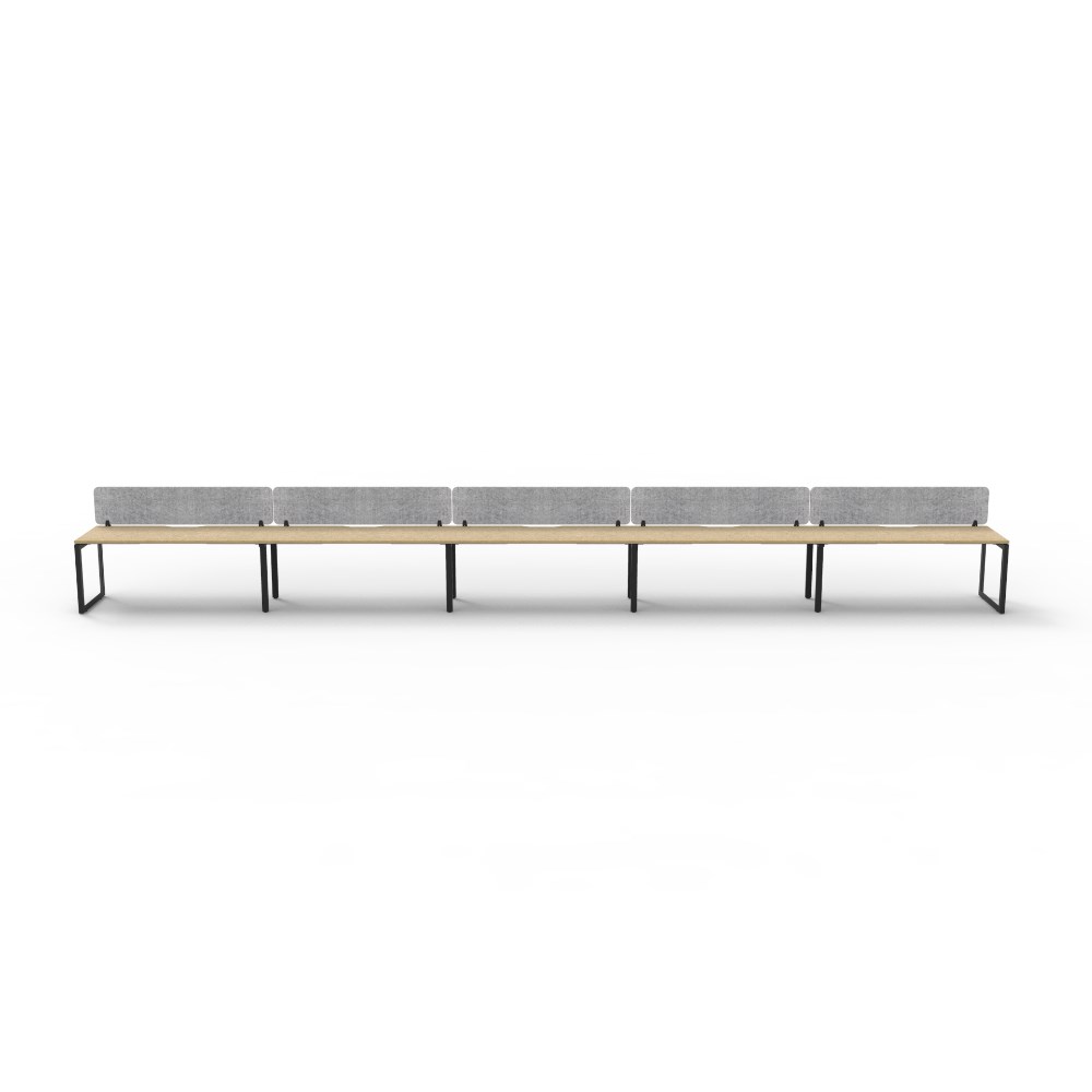 5 person single sided workstation with Natural Oak top and Black Satin frame, Grey Eco screen.