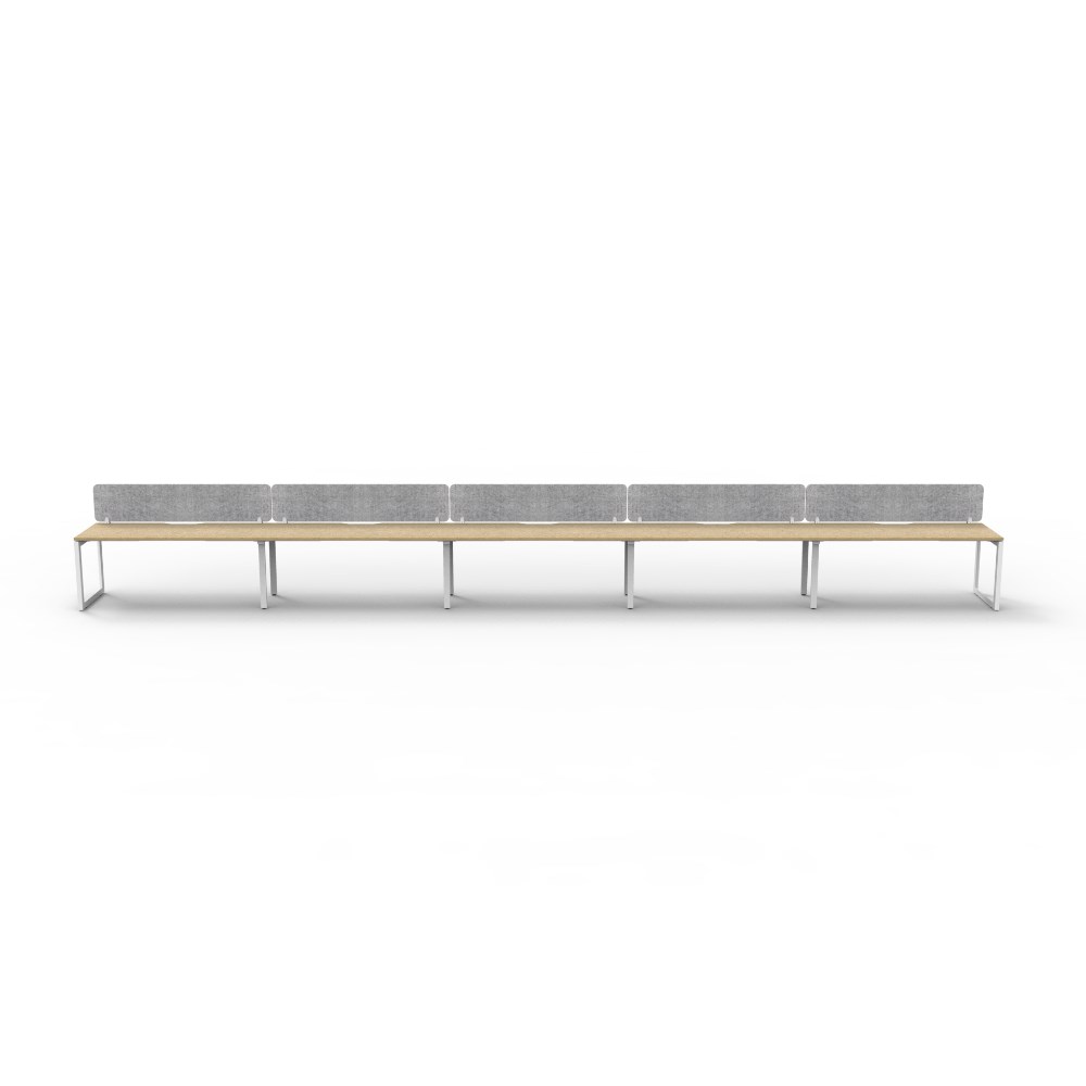 5 person single sided workstation with Natural Oak top and White Satin frame, Grey Eco screen.