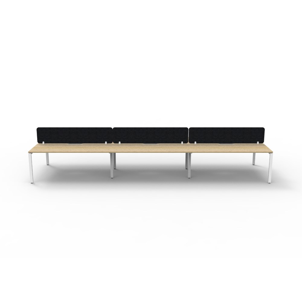 6 person double sided workstation with Natural Oak top and White Satin frame, Black Eco screen.