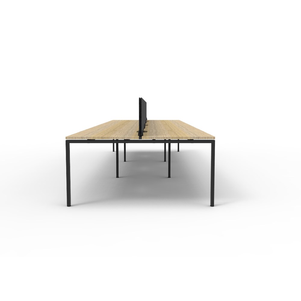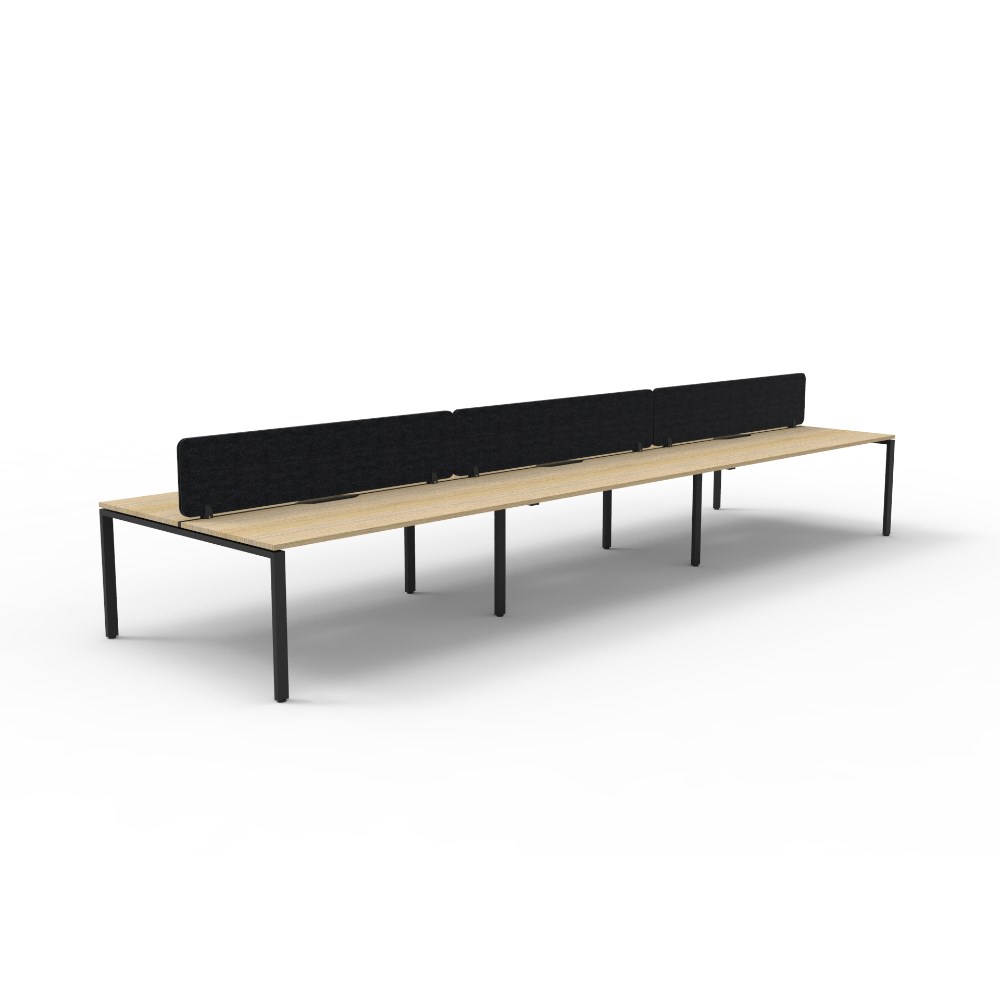 6 person double sided workstation with Natural Oak top and Black Satin frame, Black Eco screen.