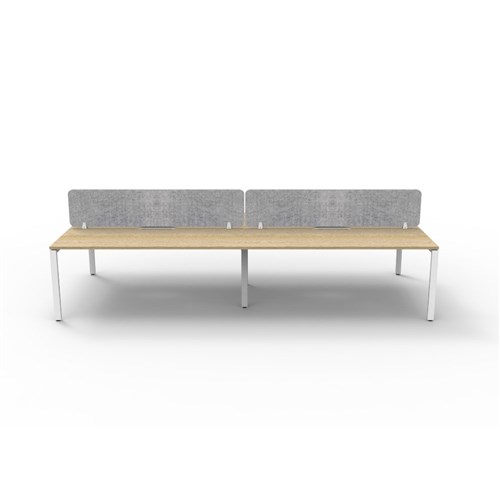 4 person double sided workstation with Natural Oak top and White Satin frame, Grey Eco screen.