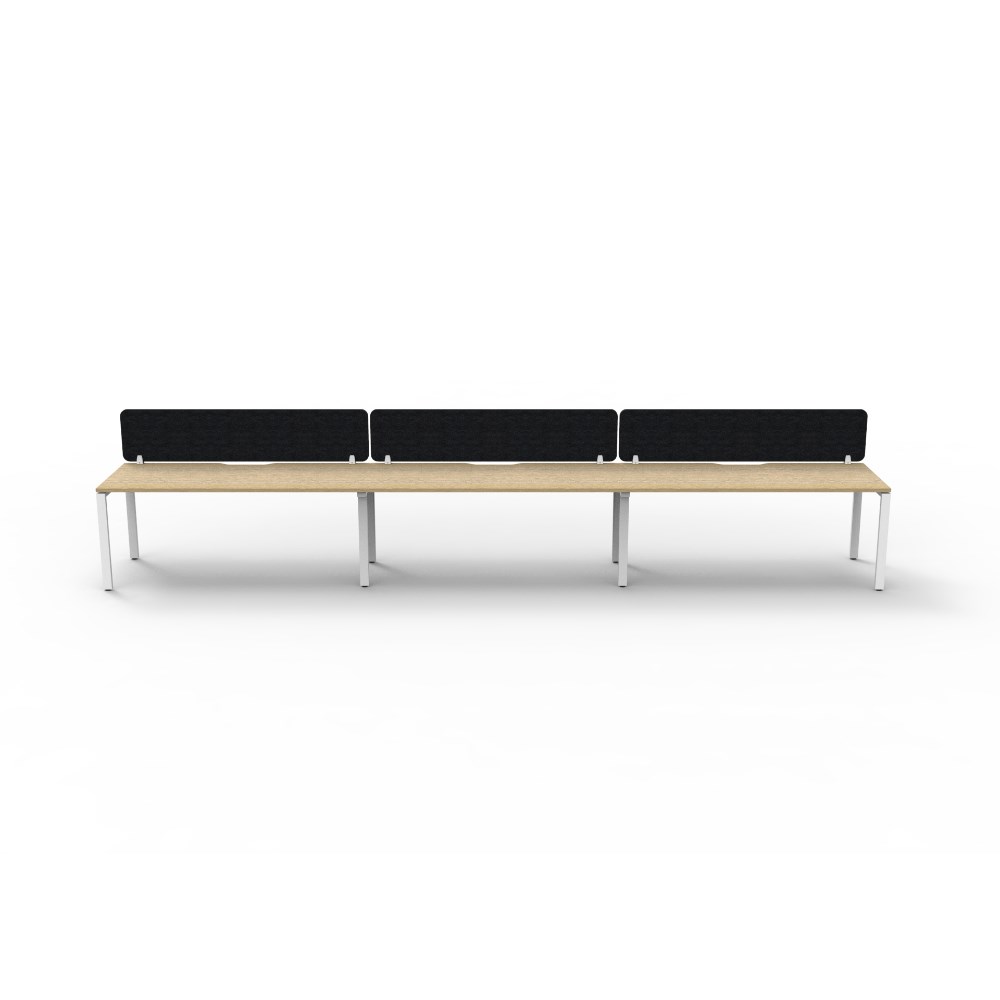 3 person single sided workstation with Natural Oak top and White Satin frame, Black Eco screen.