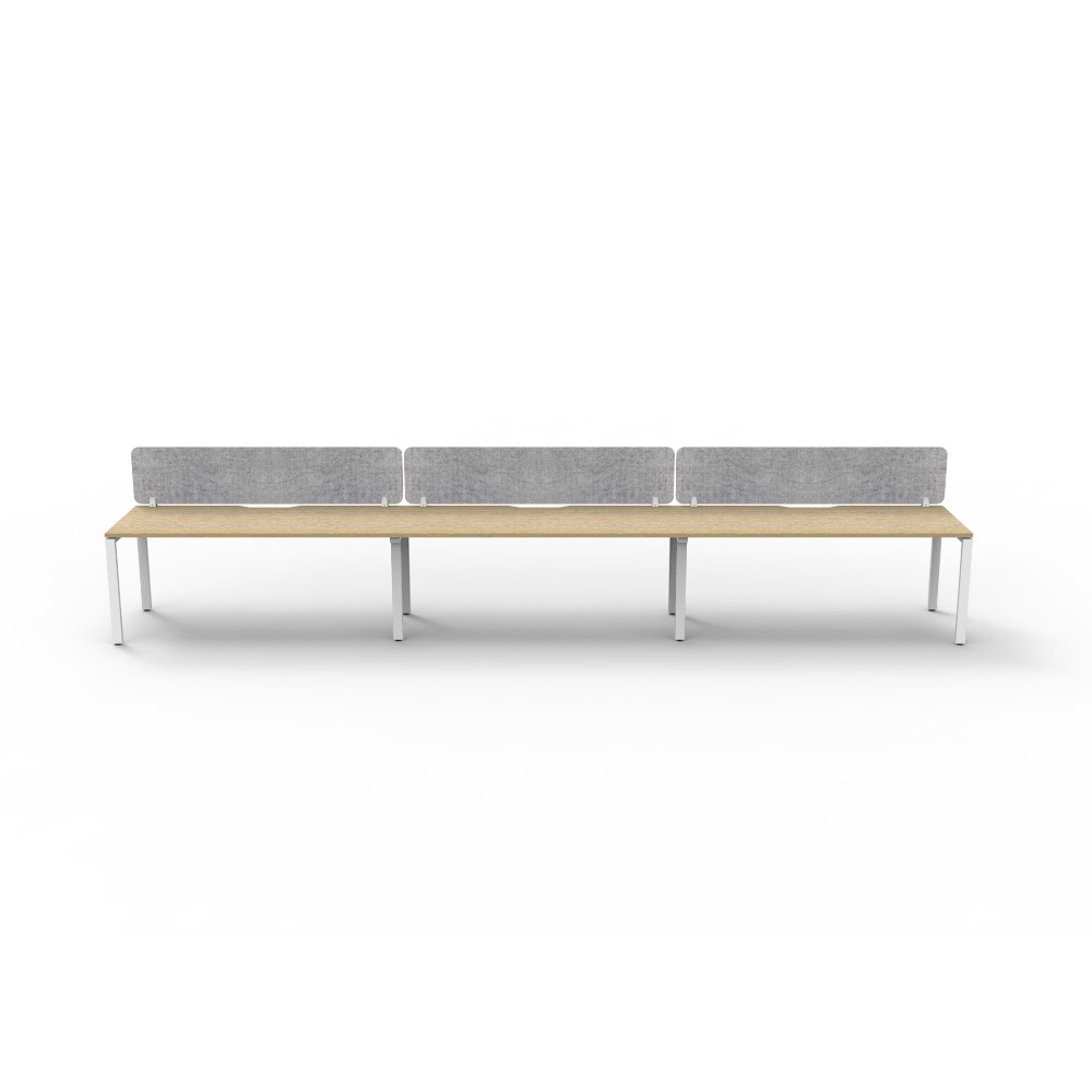 3 person single sided workstation with Natural Oak top and White Satin frame, Grey Eco screen.
