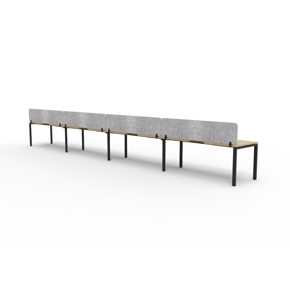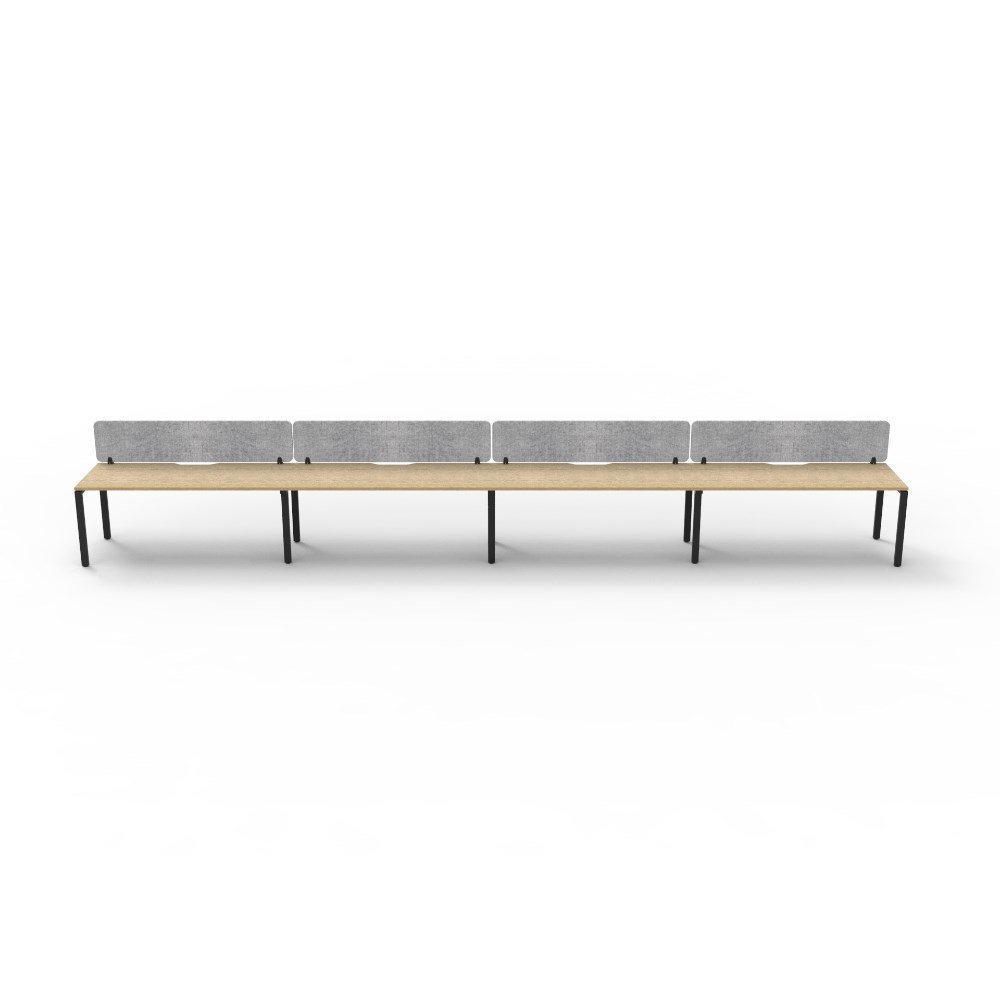 4 person single sided workstation with Natural Oak top and Black Satin frame, Grey Eco screen.