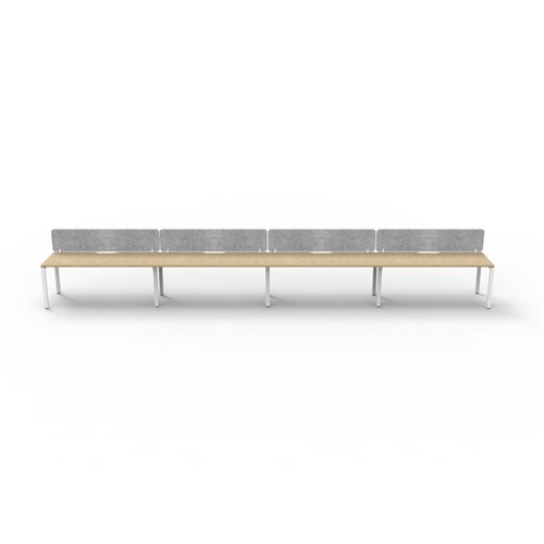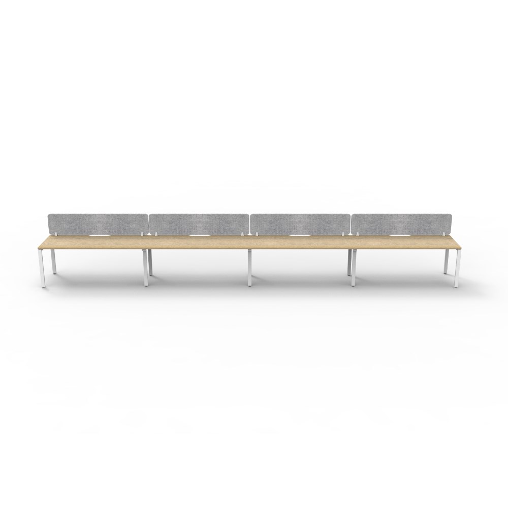 4 person single sided workstation with Natural Oak top and White Satin frame, Grey Eco screen.