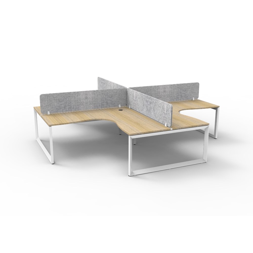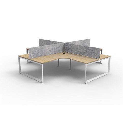 4 person corner workstation POD with Natural Oak top and White Satin frame, Grey Eco screen.
