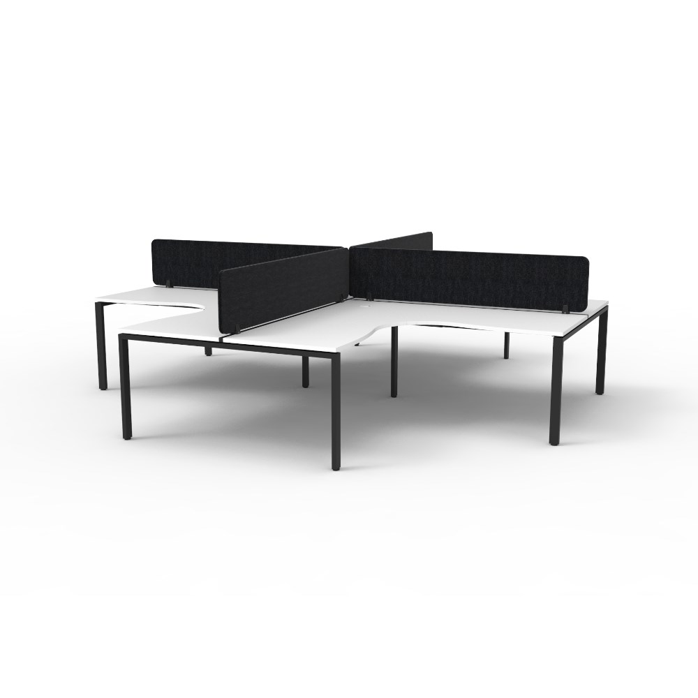 4 person corner workstation POD with White top and Black Satin frame, Black Eco screen.