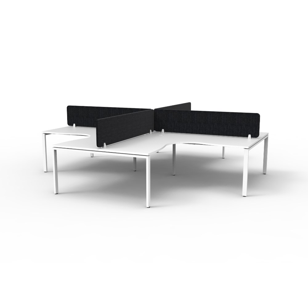 4 person corner workstation POD with White top and White Satin frame, Black Eco screen.