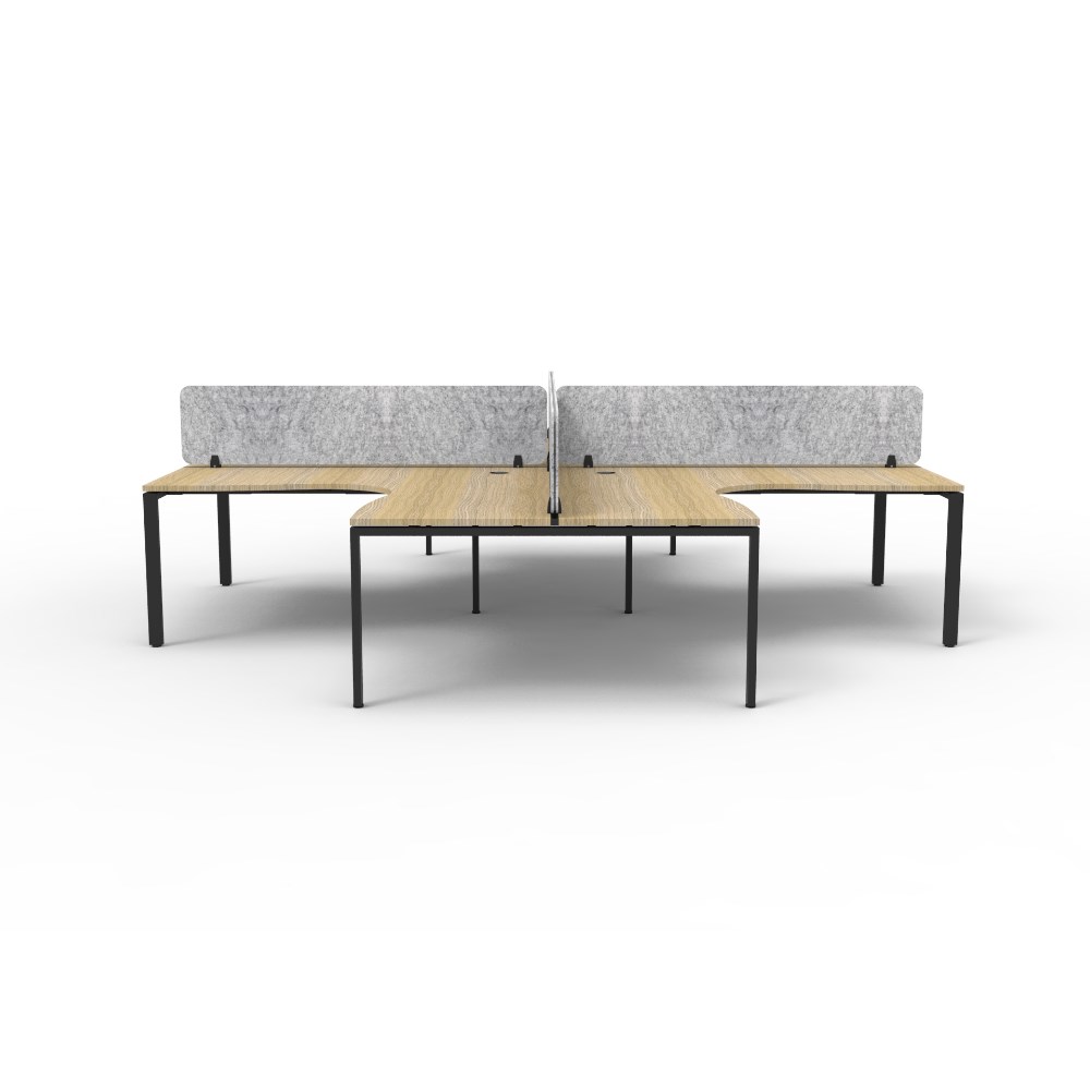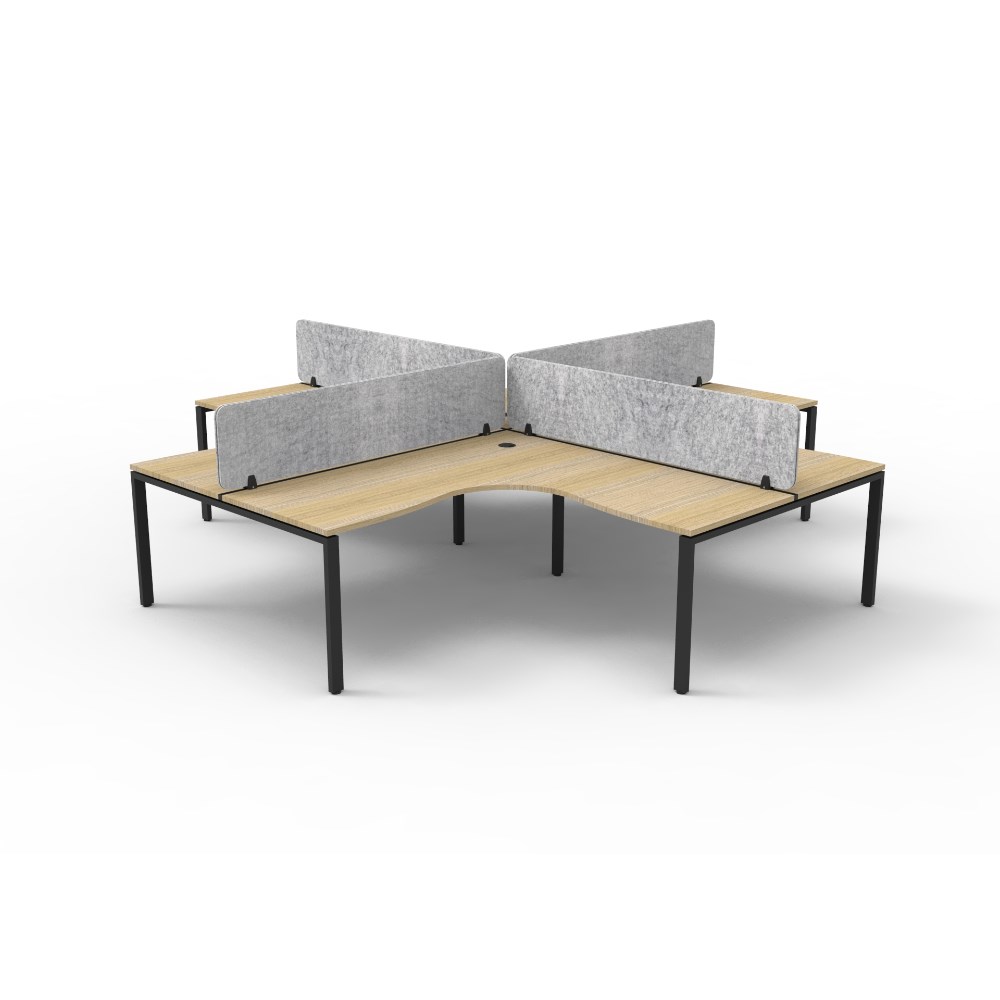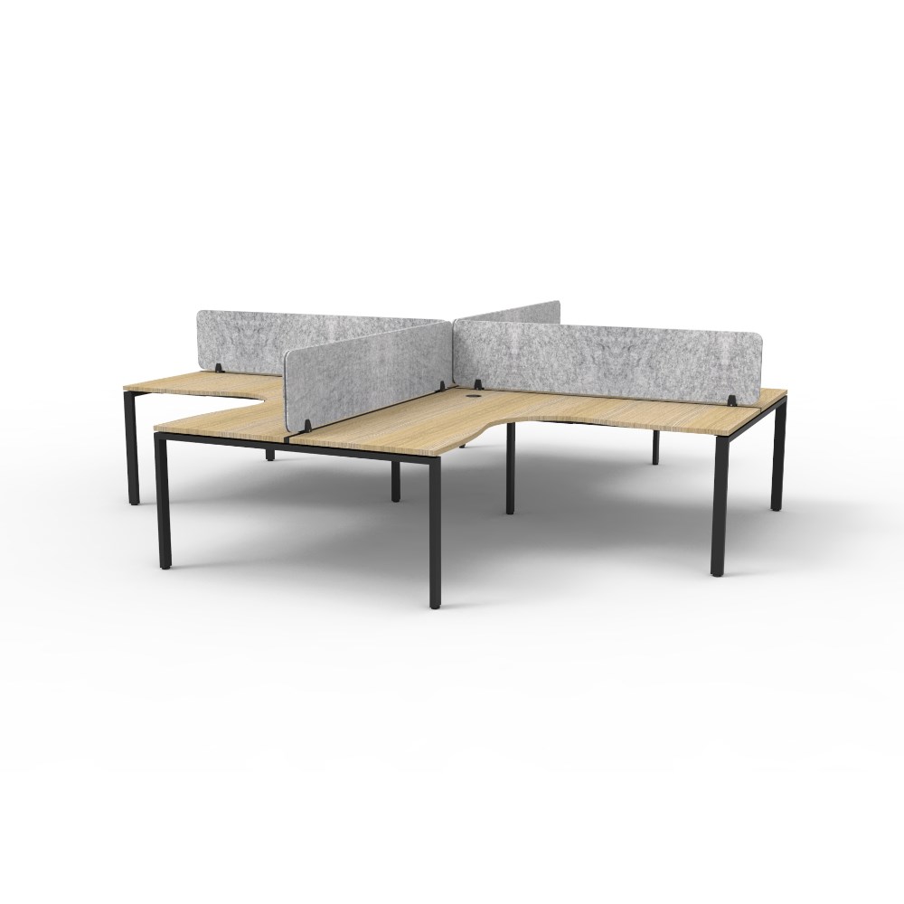 4 person corner workstation POD with Natural Oak top and Black Satin frame, Grey Eco screen.