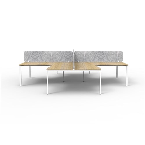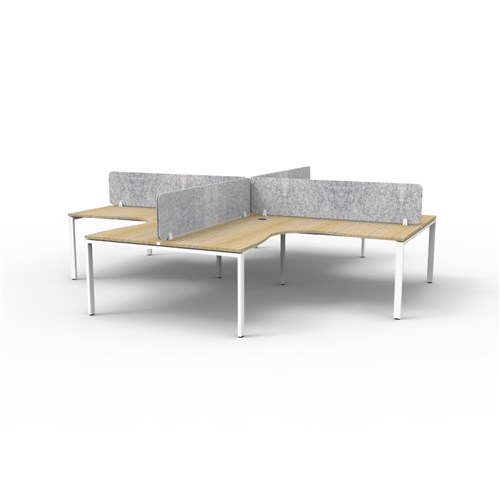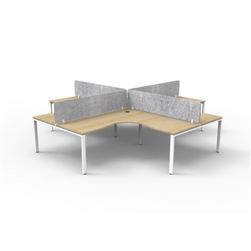 4 person corner workstation POD with Natural Oak top and White Satin frame, Grey Eco screen.
