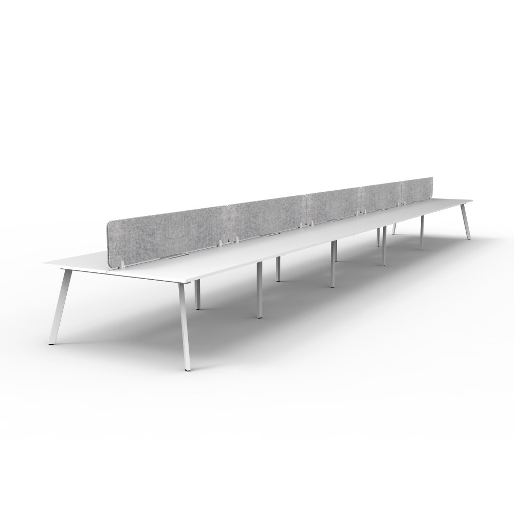 10 person double sided workstation with Natural White top and White Satin frame, Grey Eco screen.