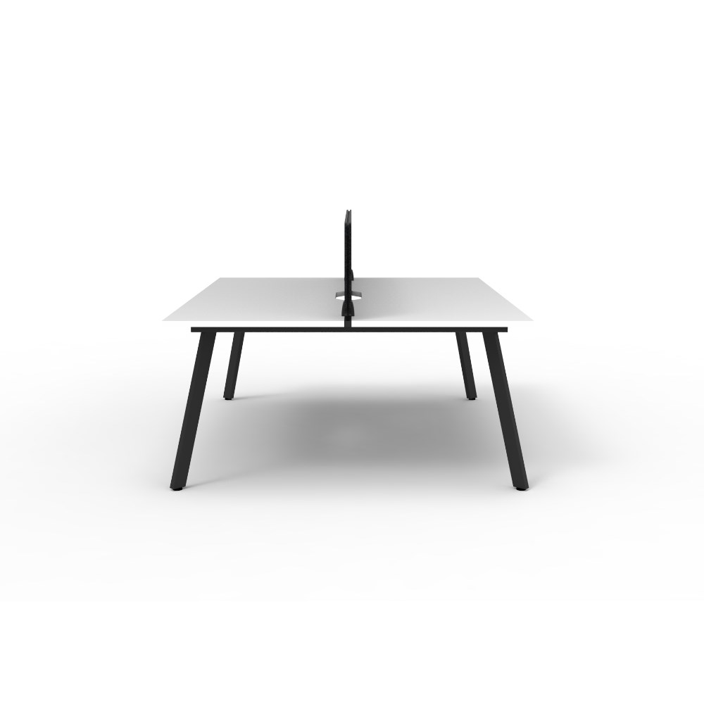 2 person double sided workstation with Natural White top and Black Satin frame, Black Eco screen.