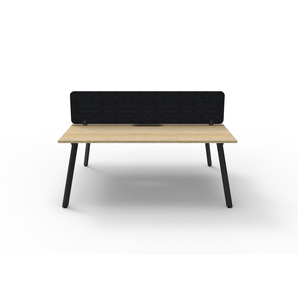 2 person double sided workstation with Natural Oak top and Black Satin frame, Black Eco screen.