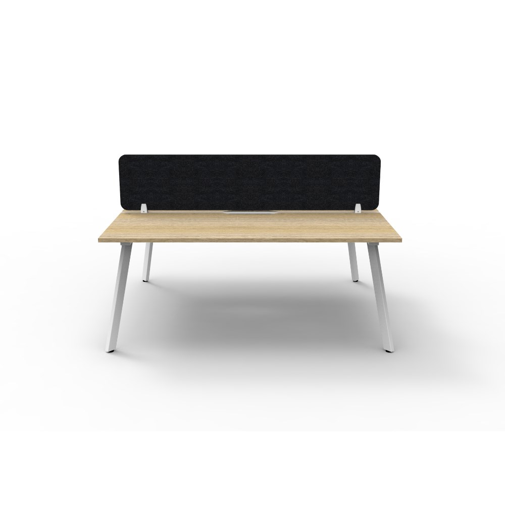 2 person double sided workstation with Natural Oak top and White Satin frame, Black Eco screen.