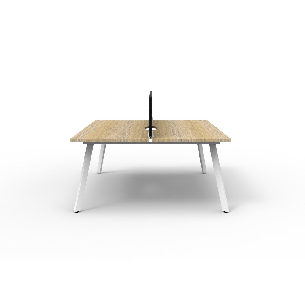 2 person double sided workstation with Natural Oak top and White Satin frame, Black Eco screen.