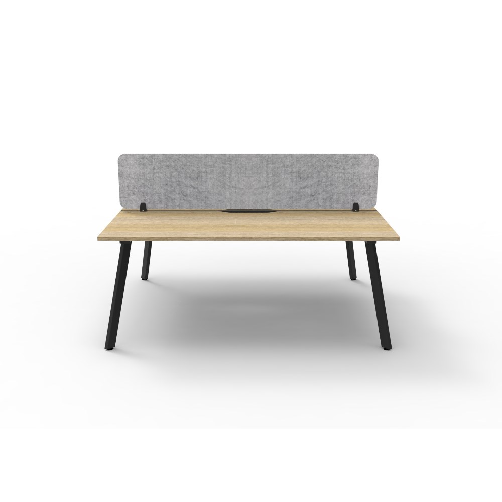 2 person double sided workstation with Natural Oak top and Black Satin frame, Grey Eco screen.