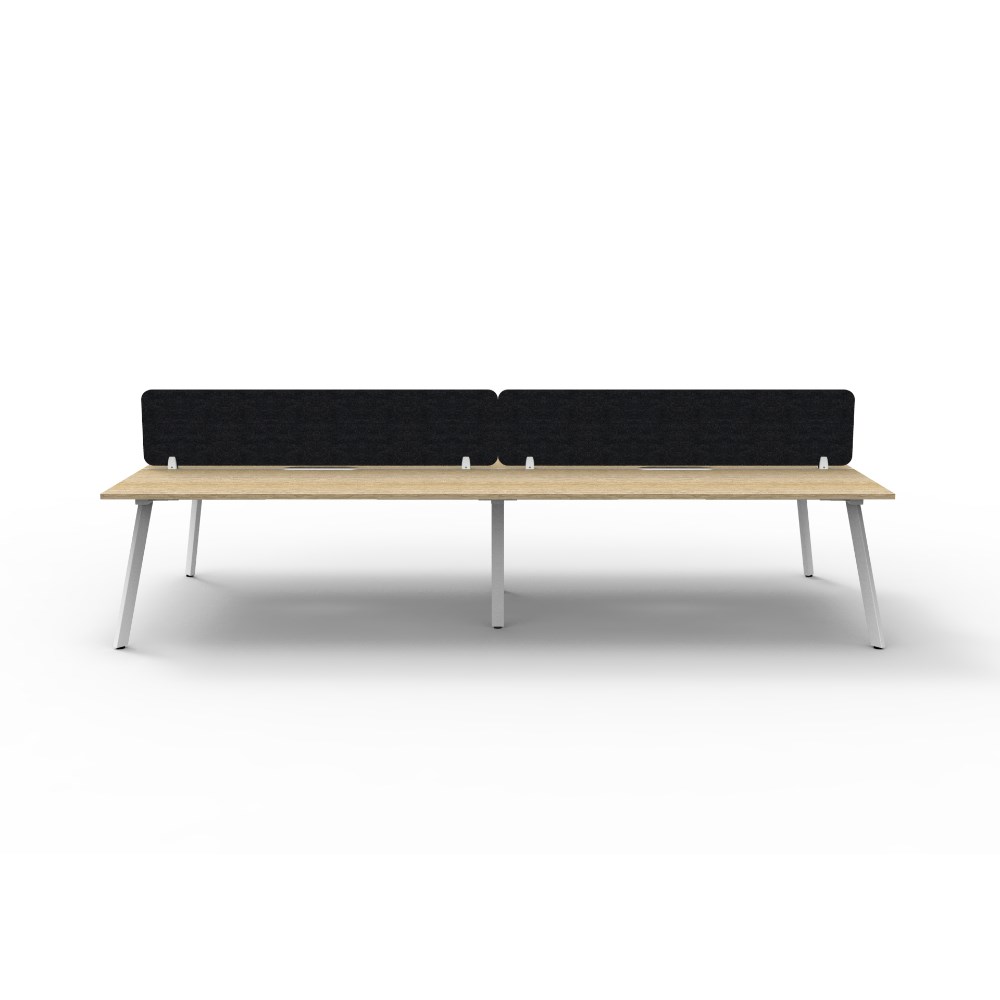 4 person double sided workstation with Natural Oak top and White Satin frame, Black Eco screen.