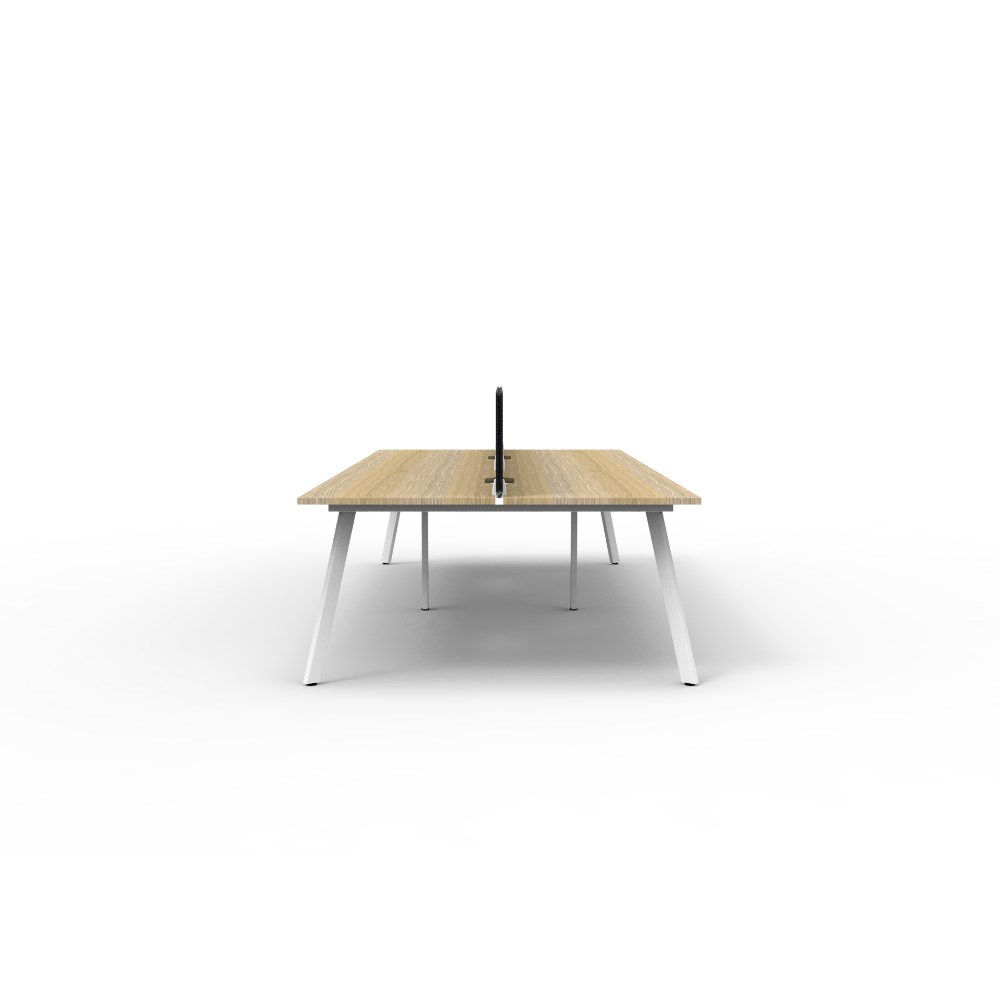 4 person double sided workstation with Natural Oak top and White Satin frame, Black Eco screen.