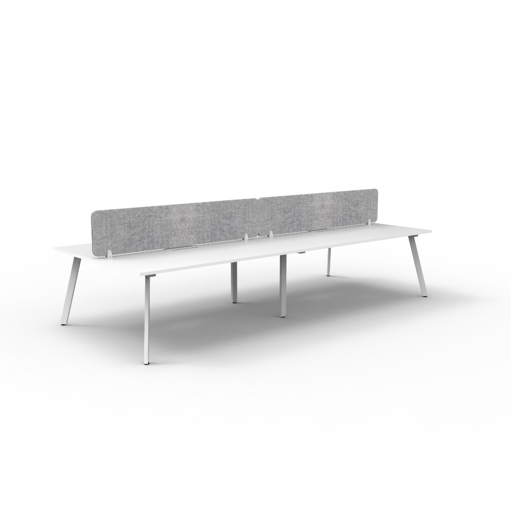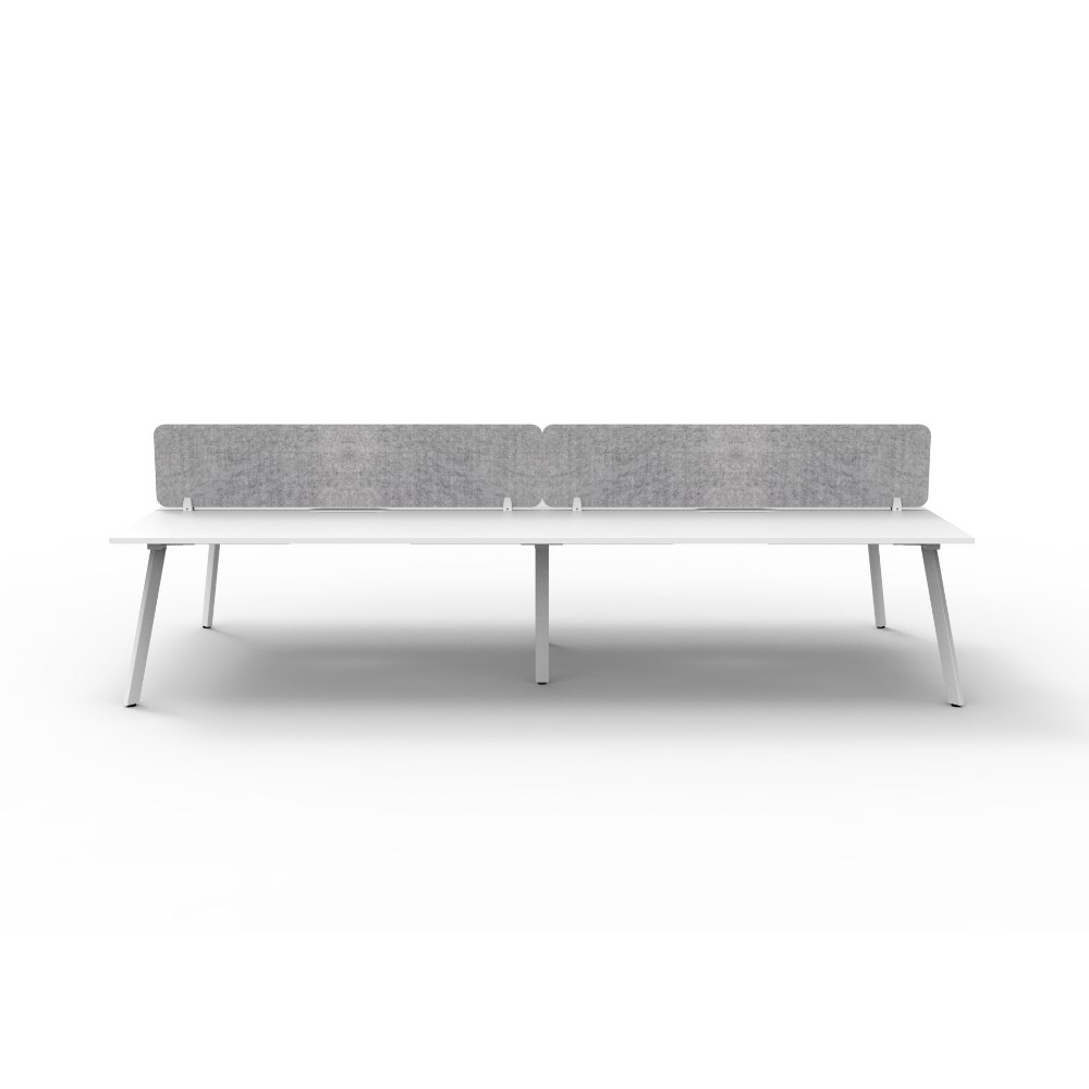 4 person double sided workstation with Natural White top and White Satin frame, Grey Eco screen.