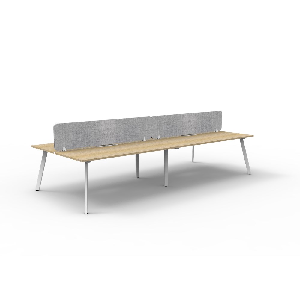 4 person double sided workstation with Natural Oak top and White Satin frame, Grey Eco screen.