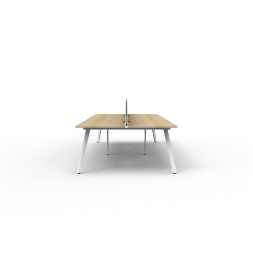 4 person double sided workstation with Natural Oak top and White Satin frame, Grey Eco screen.