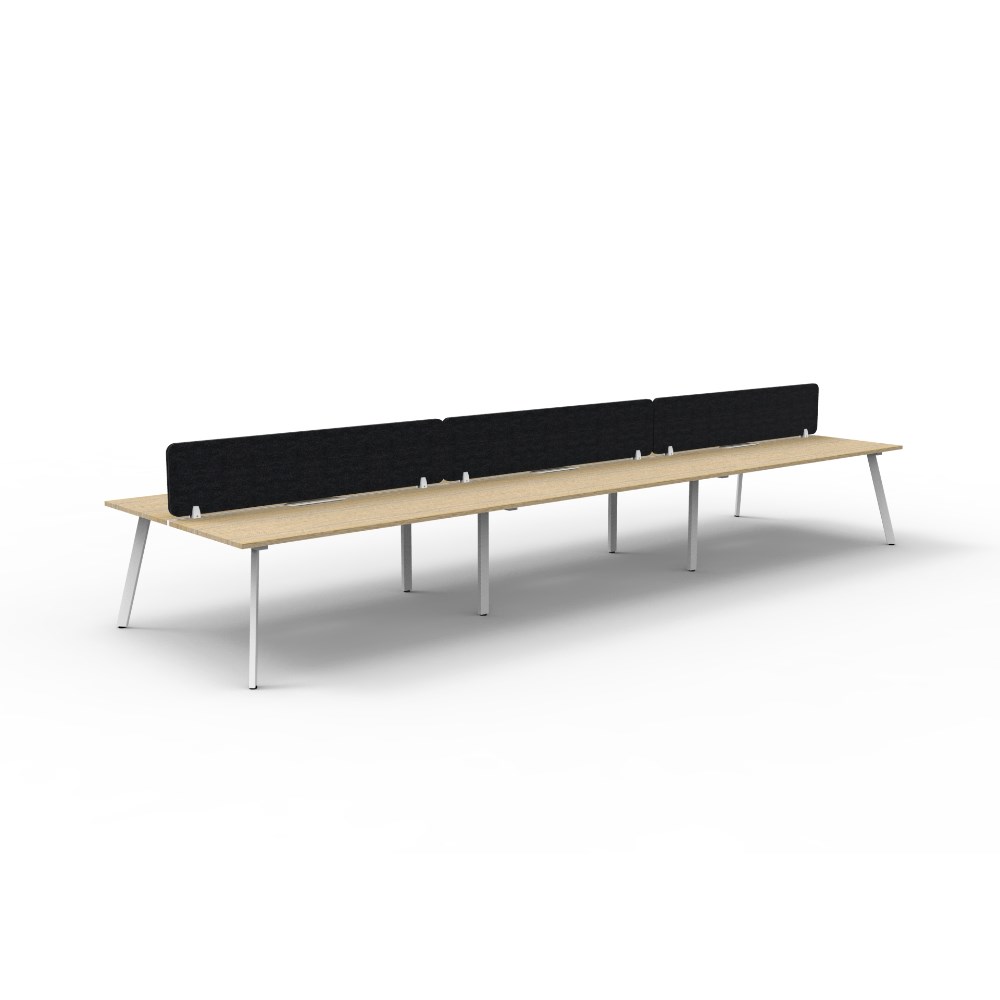 6 person double sided workstation with Natural Oak top and White Satin frame, Black Eco screen.