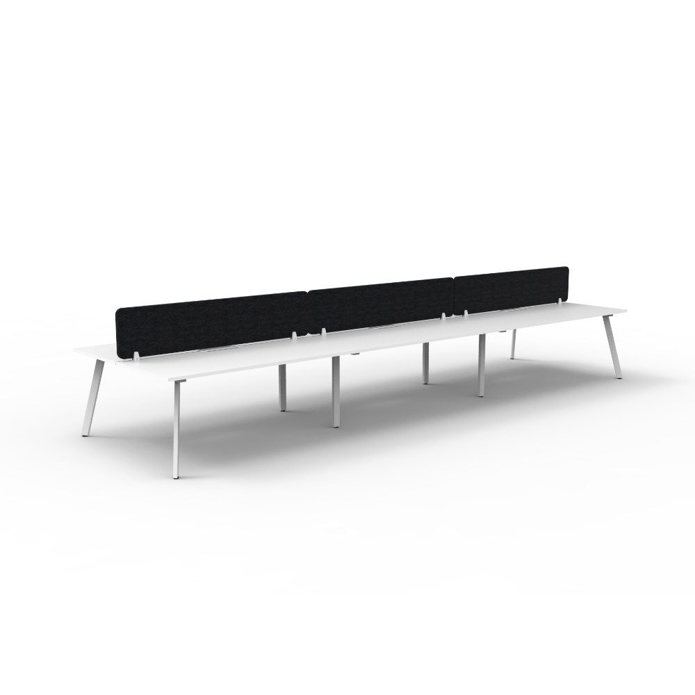 6 person double sided workstation with Natural White top and White Satin frame, Black Eco screen.