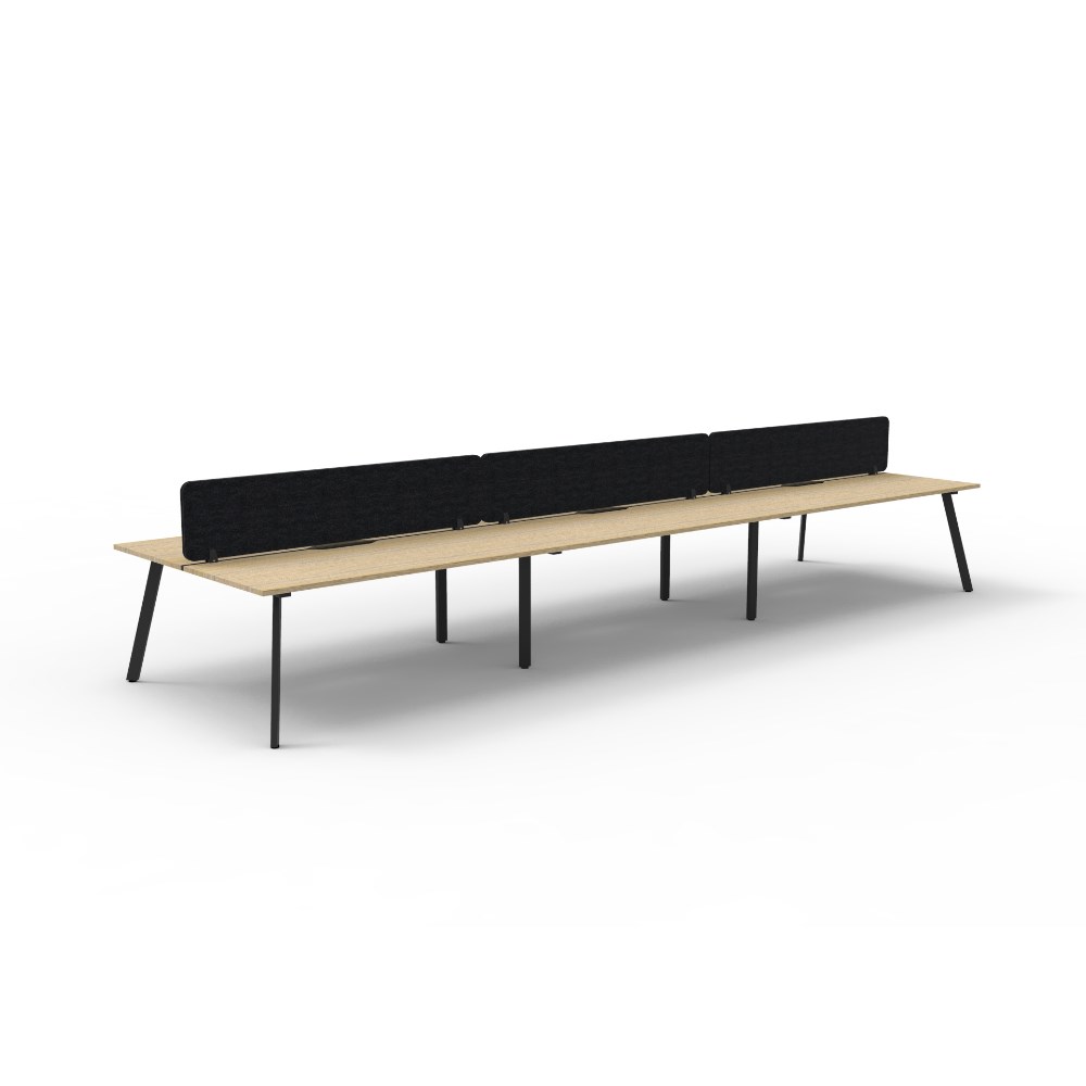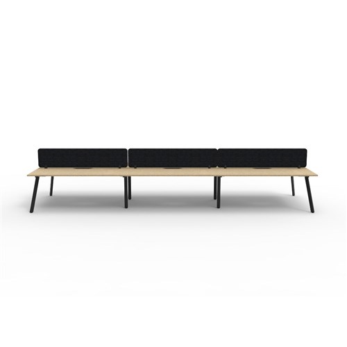 6 person double sided workstation with Natural Oak top and Black Satin frame, Black Eco screen.