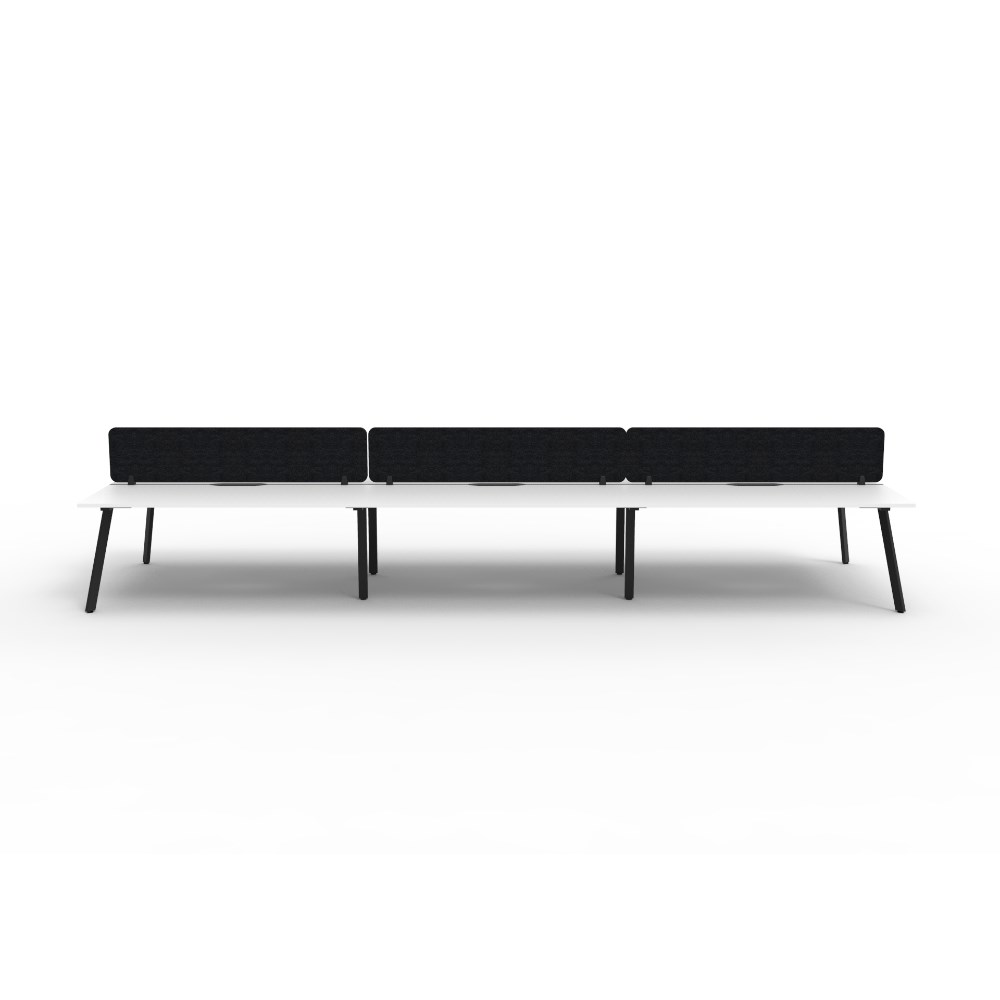 6 person double sided workstation with Natural White top and Black Satin frame, Black Eco screen.