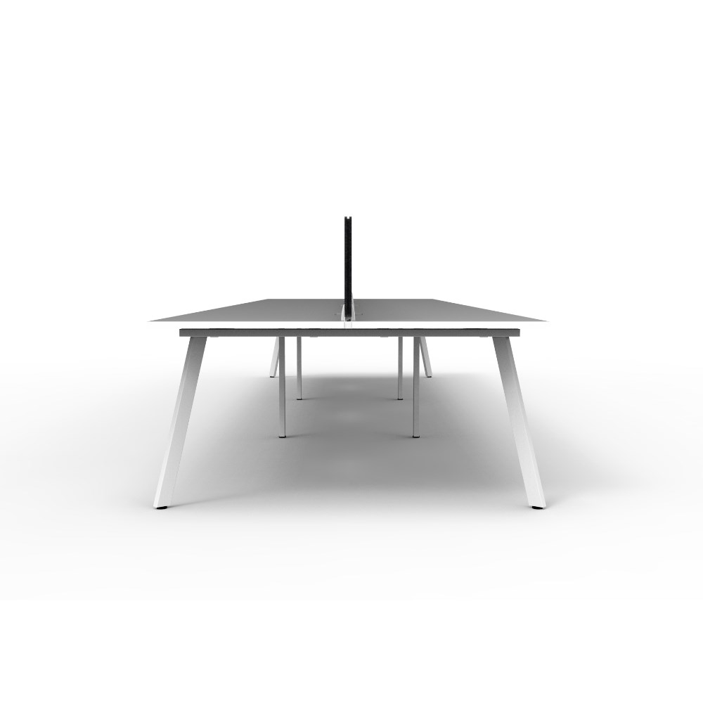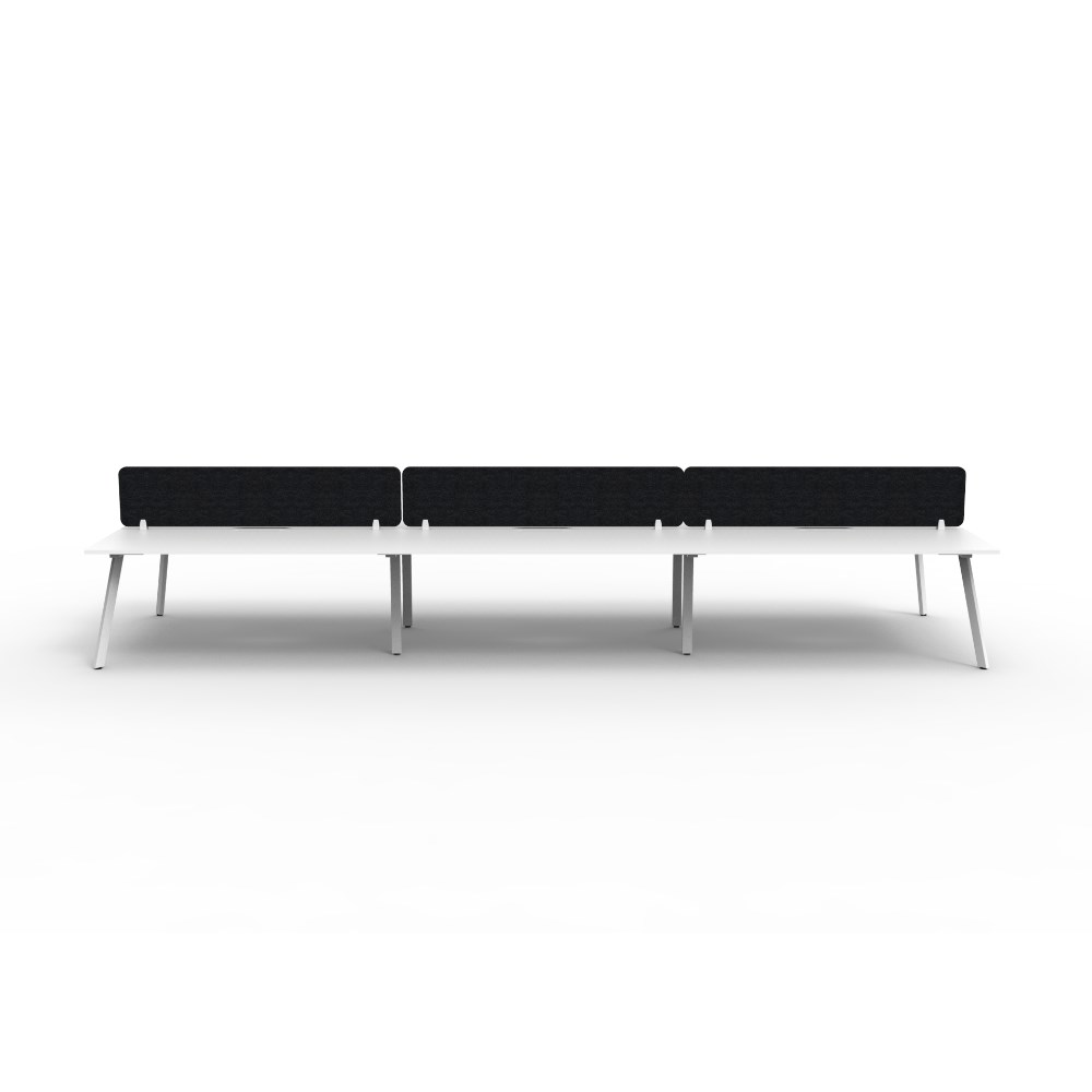 6 person double sided workstation with Natural White top and White Satin frame, Black Eco screen.