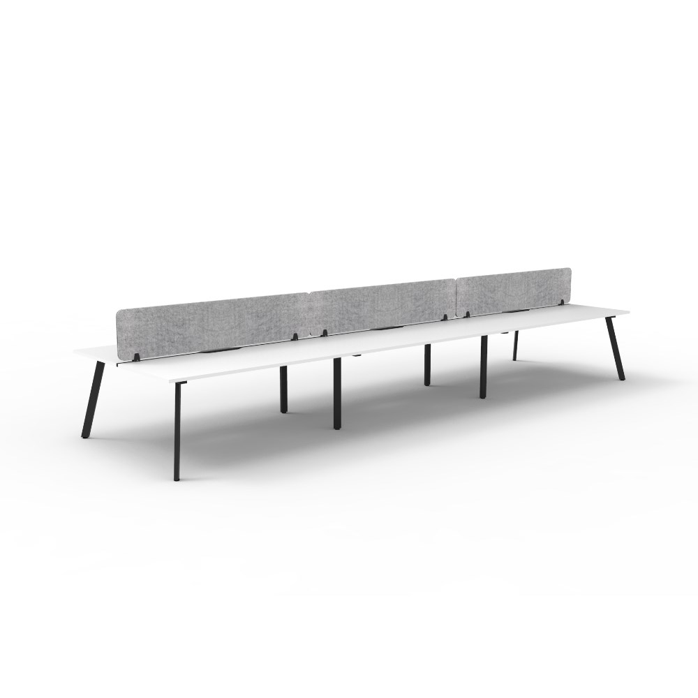 6 person double sided workstation with Natural White top and Black Satin frame, Grey Eco screen.