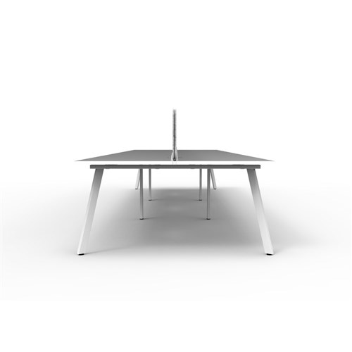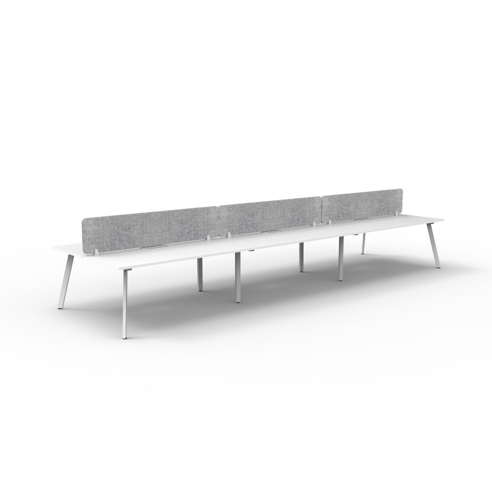 6 person double sided workstation with Natural White top and White Satin frame, Grey Eco screen.