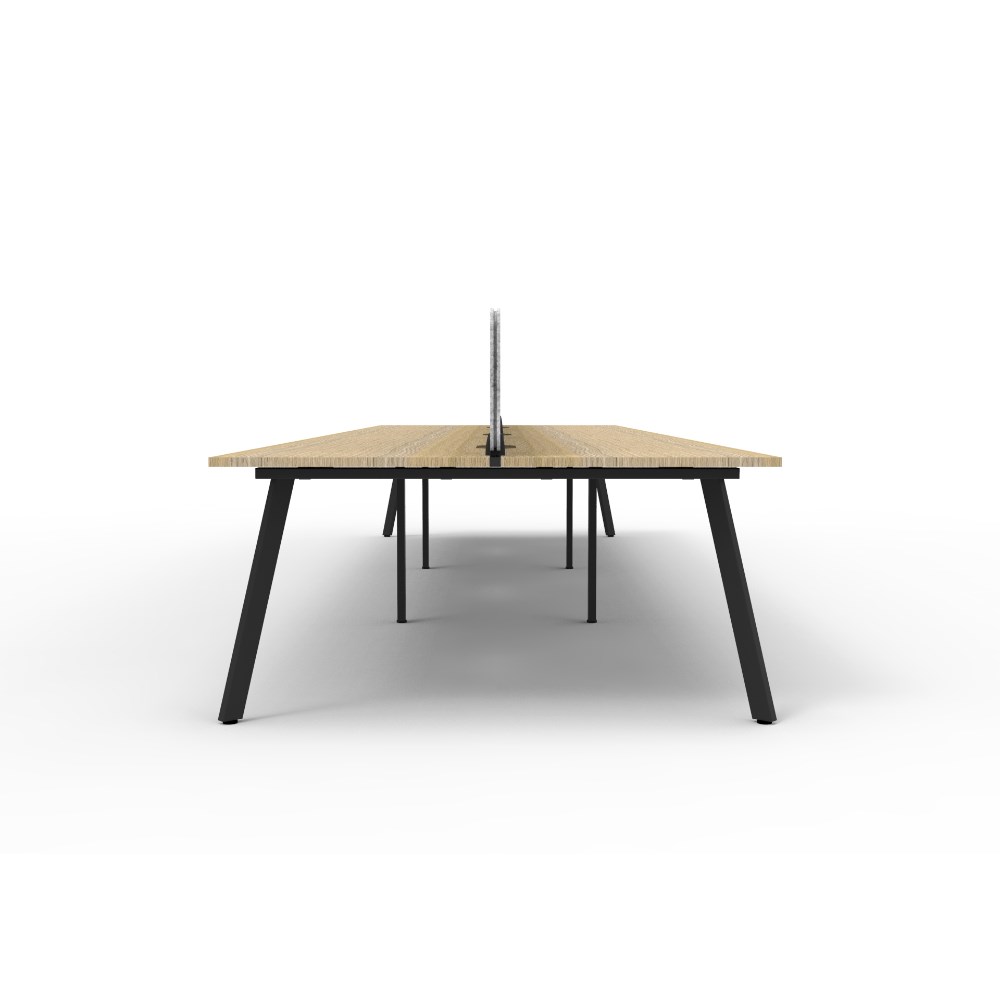 6 person double sided workstation with Natural Oak top and Black Satin frame, Grey Eco screen.