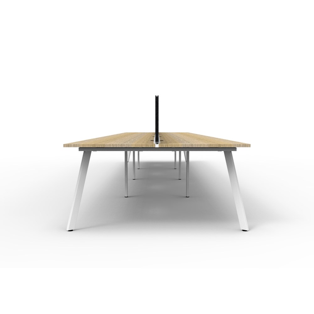 8 person double sided workstation with Natural Oak top and White Satin frame, Black Eco screen.