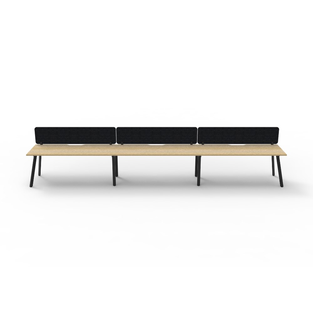 3 person single sided workstation with Natural Oak top and Black Satin frame, Black Eco screen.