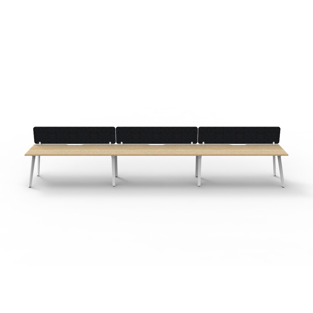 3 person single sided workstation with Natural Oak top and White Satin frame, Black Eco screen.