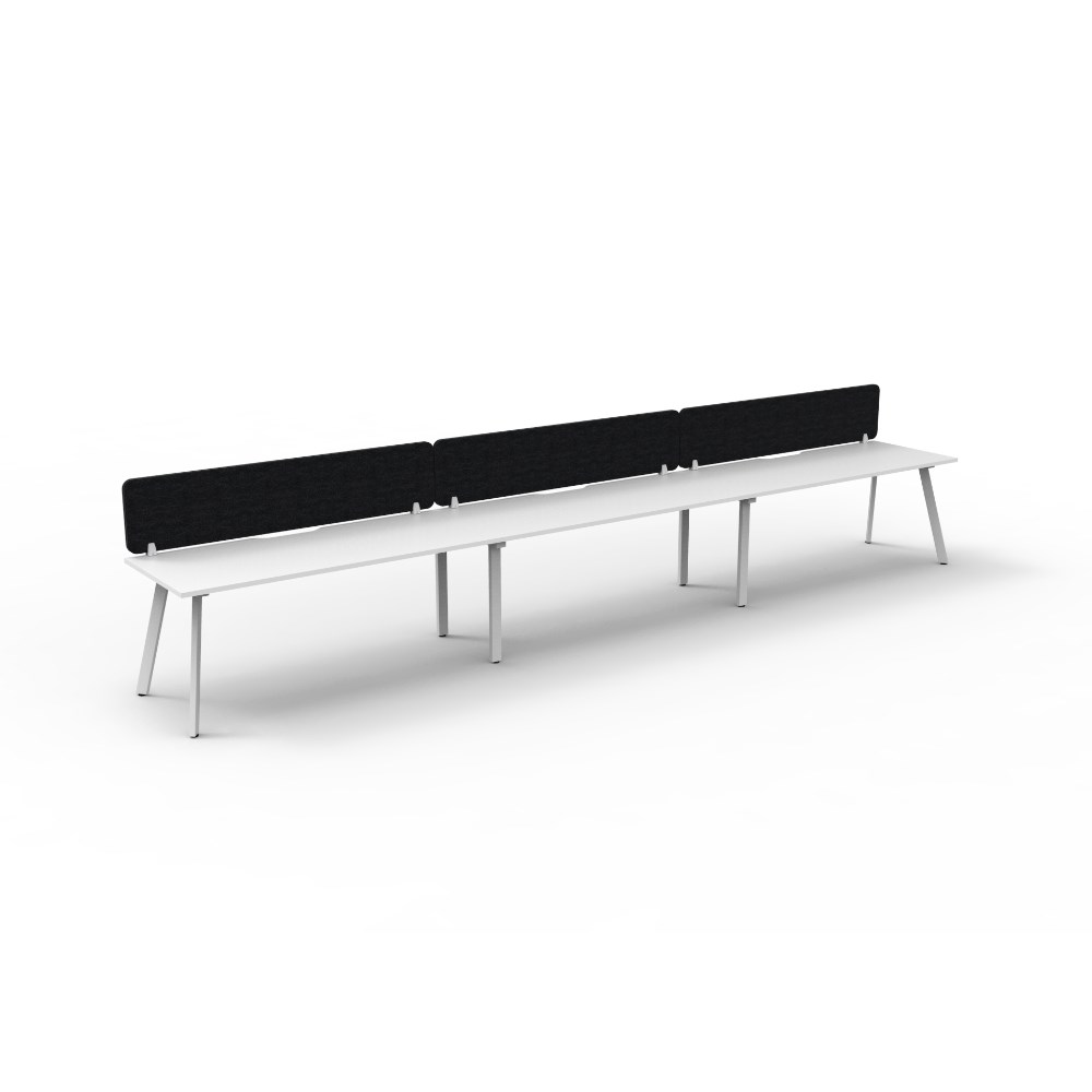 3 person single sided workstation with Natural White top and White Satin frame, Black Eco screen.