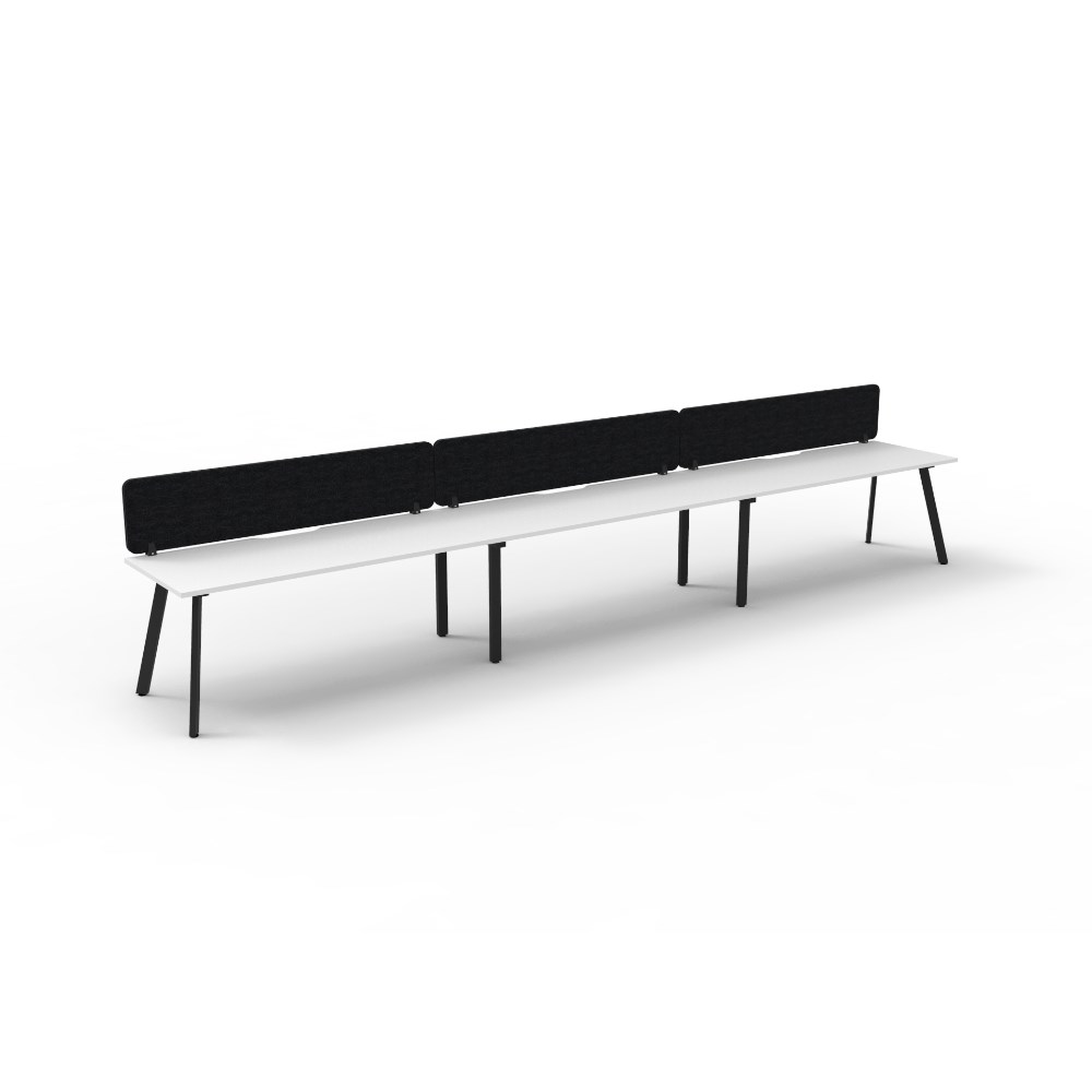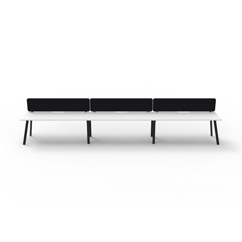 3 person single sided workstation with Natural White top and Black Satin frame, Black Eco screen.