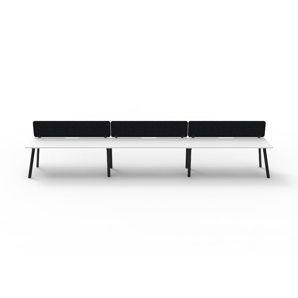 3 person single sided workstation with Natural White top and Black Satin frame, Black Eco screen.
