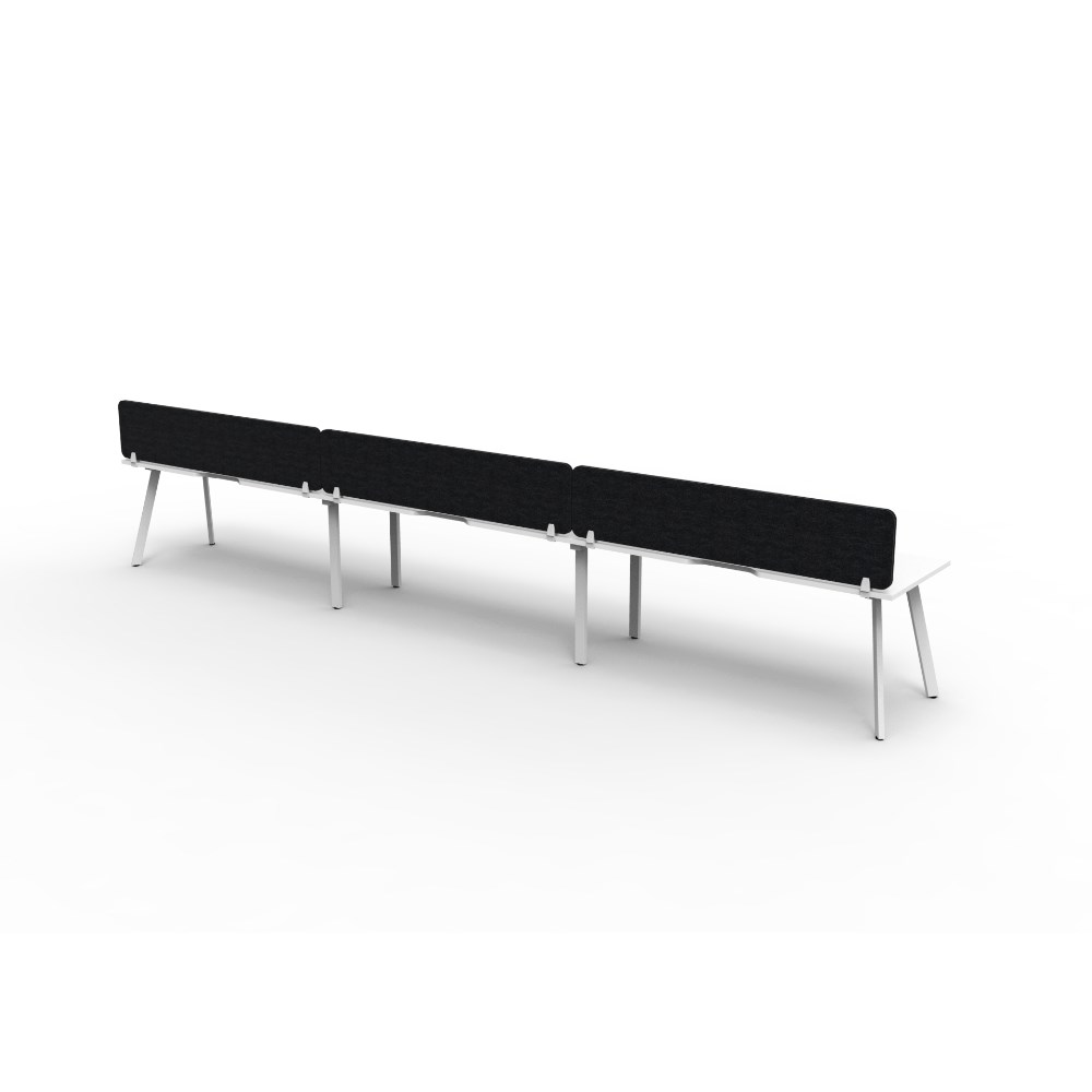 3 person single sided workstation with Natural White top and White Satin frame, Black Eco screen.