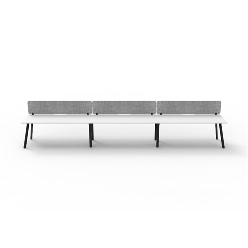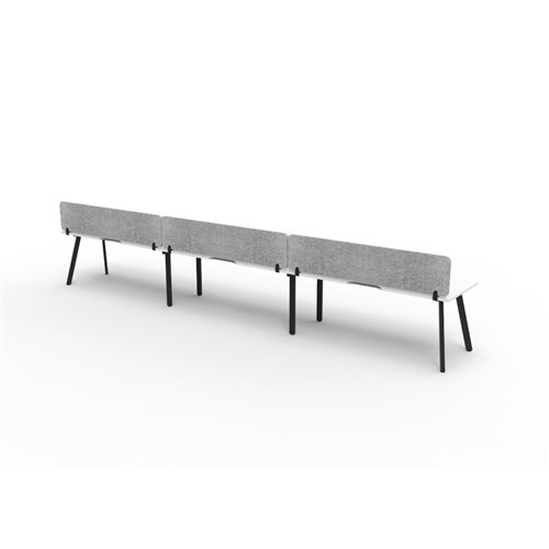 3 person single sided workstation with Natural White top and Black Satin frame, Grey Eco screen.