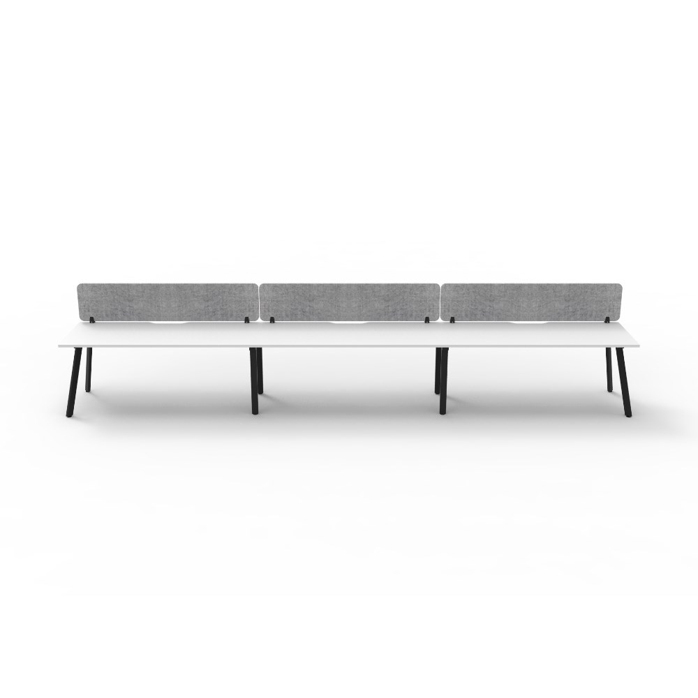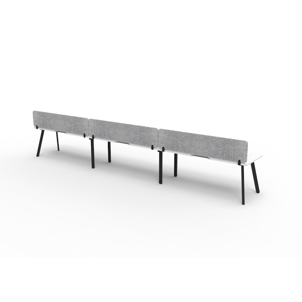 3 person single sided workstation with Natural White top and Black Satin frame, Grey Eco screen.