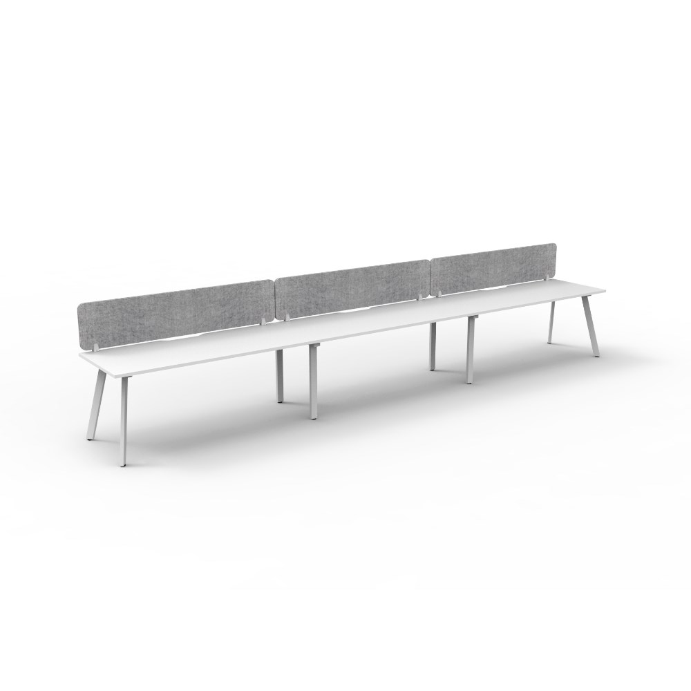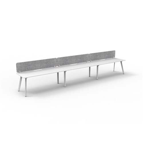 3 person single sided workstation with Natural White top and White Satin frame, Grey Eco screen.