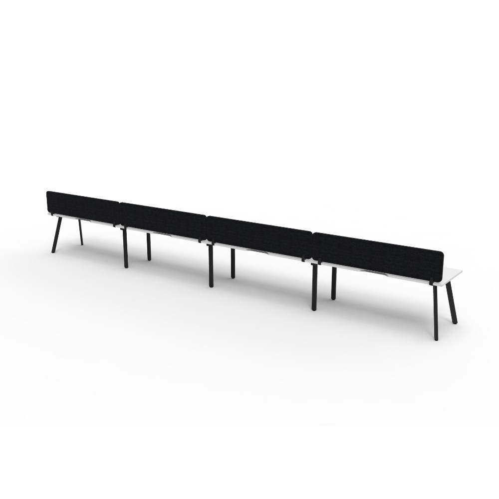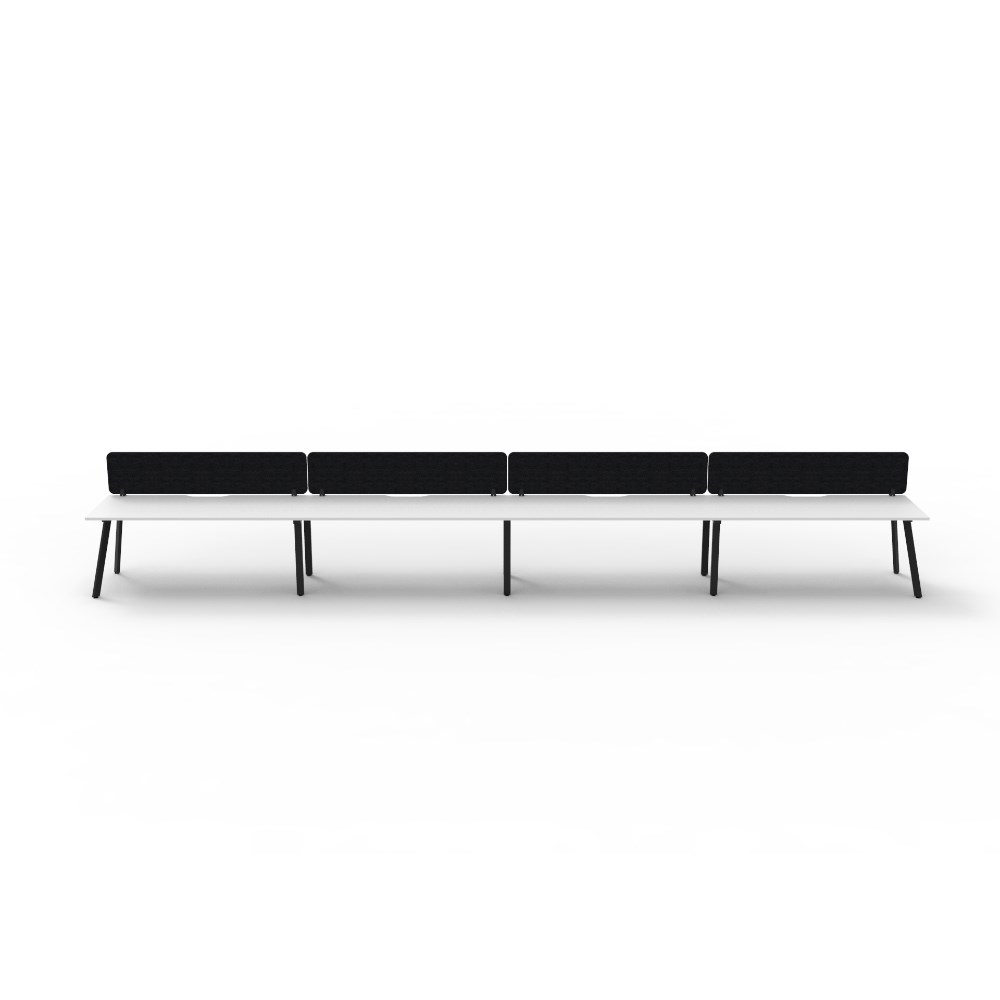 4 person single sided workstation with Natural White top and Black Satin frame, Black Eco screen.