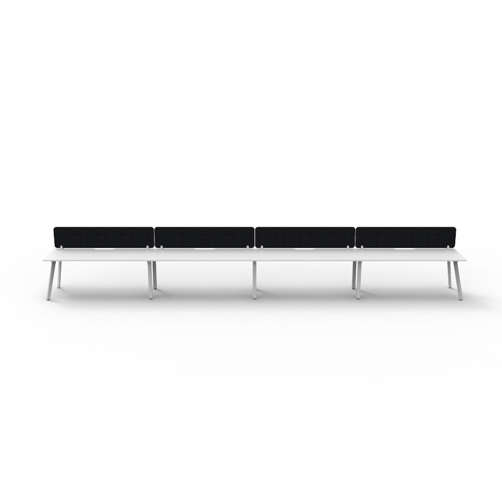 4 person single sided workstation with Natural White top and White Satin frame, Black Eco screen.