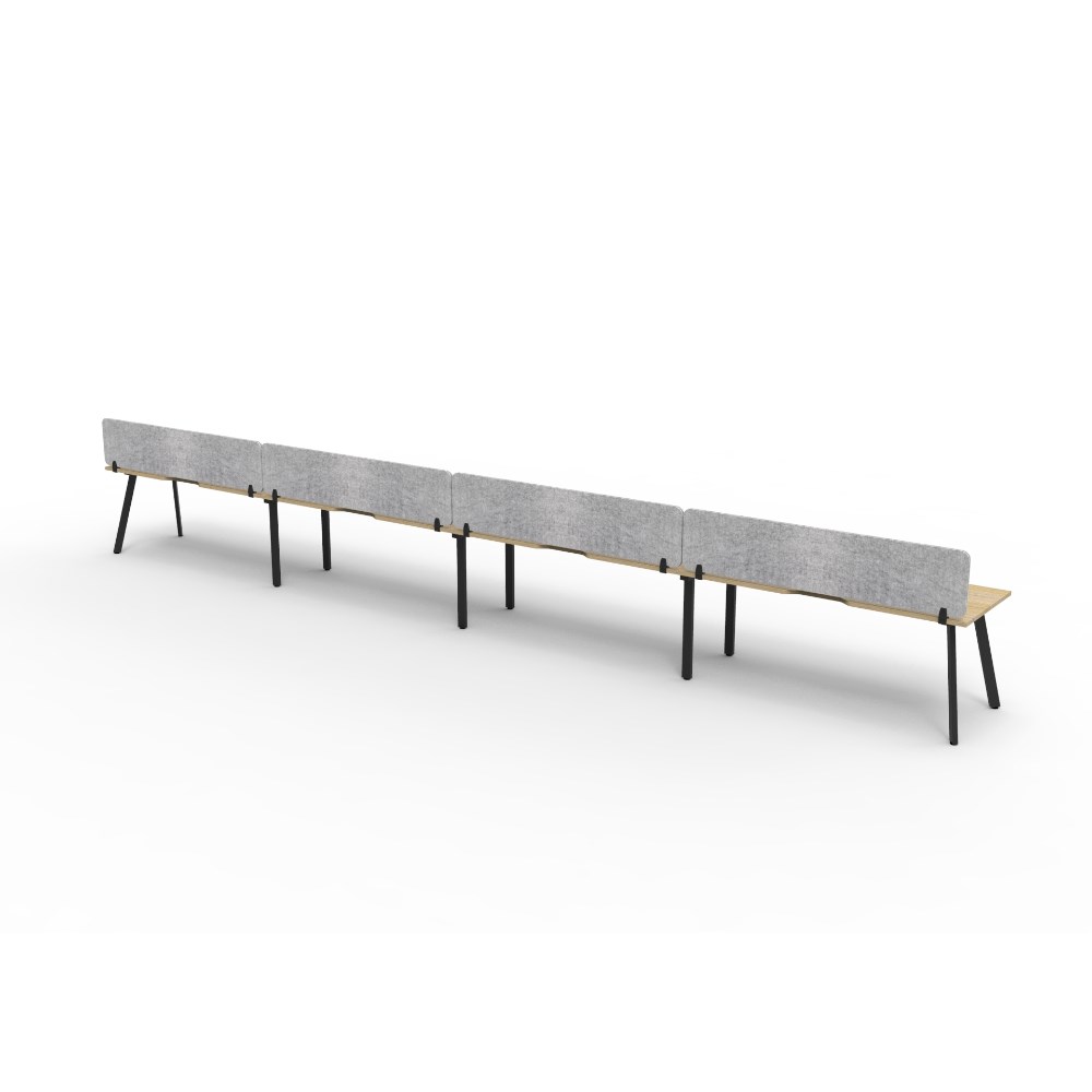 4 person single sided workstation with Natural Oak top and Black Satin frame, Grey Eco screen.
