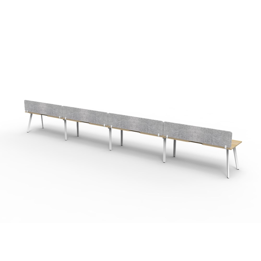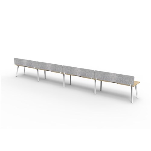 4 person single sided workstation with Natural Oak top and White Satin frame, Grey Eco screen.