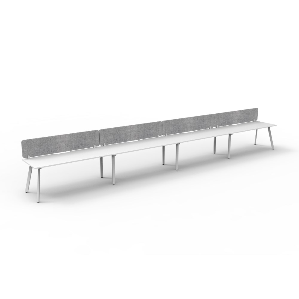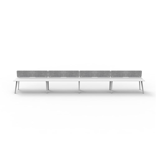 4 person single sided workstation with Natural White top and White Satin frame, Grey Eco screen.